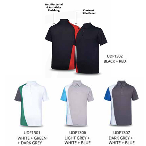 Contrast colour polyester polo t with interlock weaving. Moisture wicking and sweat absorbent. Suitable for outdoor sporting activities.