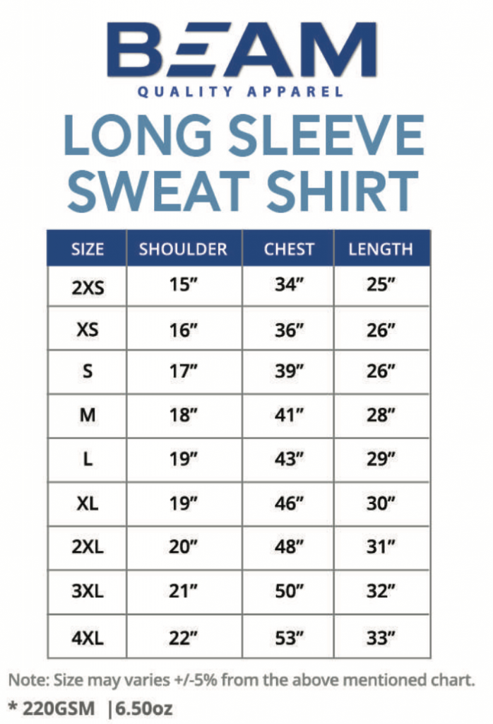 Cotton/Polyester mixture Beam long sleeve sweat shirt. Double needle cuff and waistband for added durability for long term use.