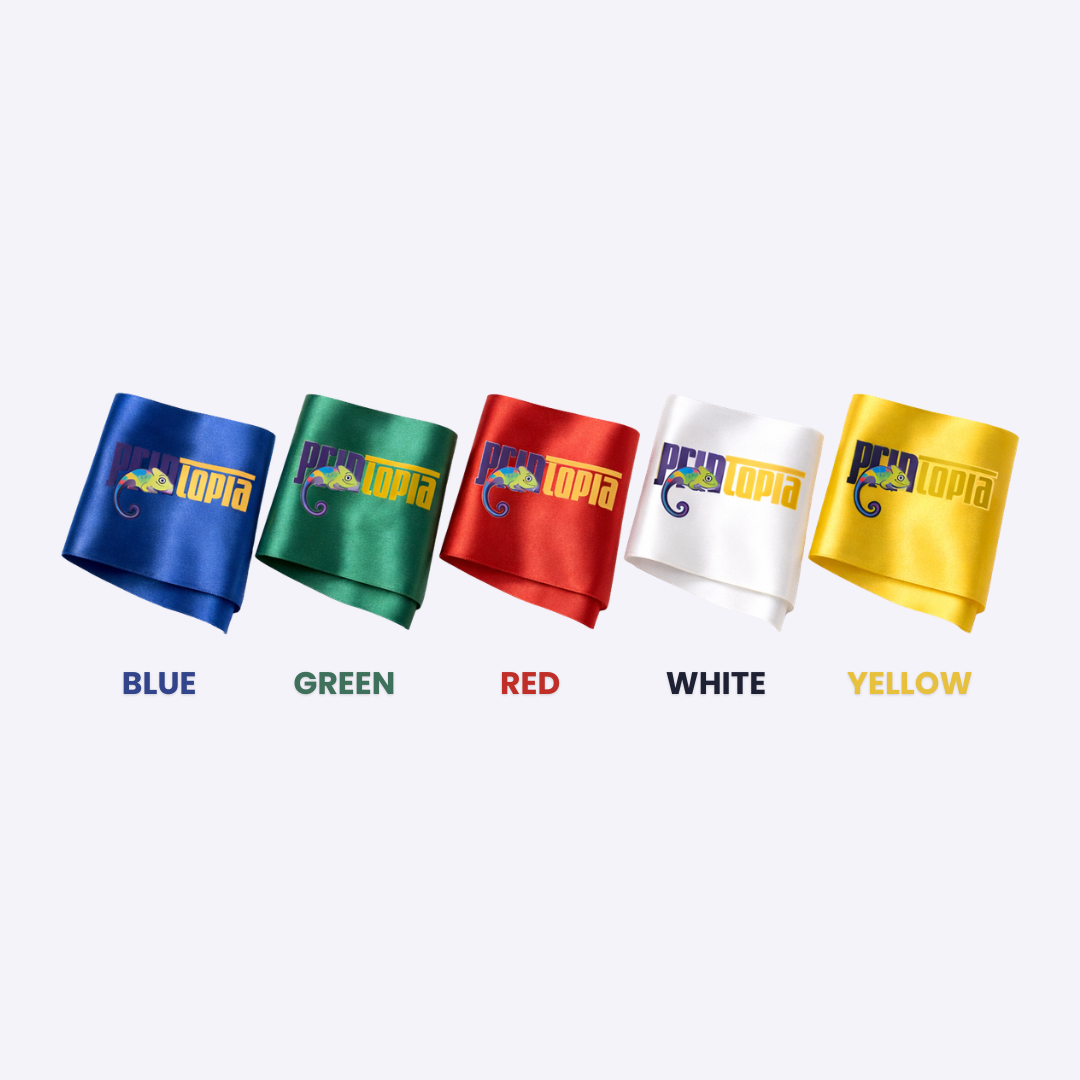The sash is made from smooth satin cloth with a clean drape and a slight sheen that catches light well in photos, which matters for a product that is likely to be photographed repeatedly. The satin surface takes print well, producing vibrant, high-contrast logos and text that are clearly legible even in candid event photography.