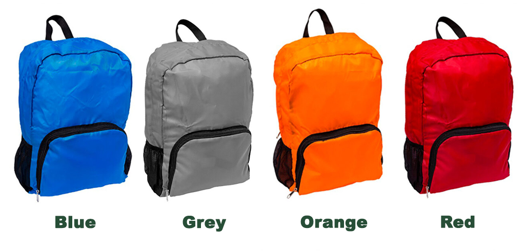 210D foldable backpack with top and front zipper compartment with side mesh pocket. Save space and easy to keep when not in use.