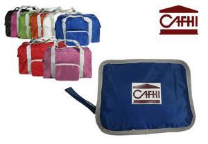 230D travel bag with adjustable shoulder strap, padded grip, strengthened bottom and front zipper pocket. Foldable design makes for neat storage.