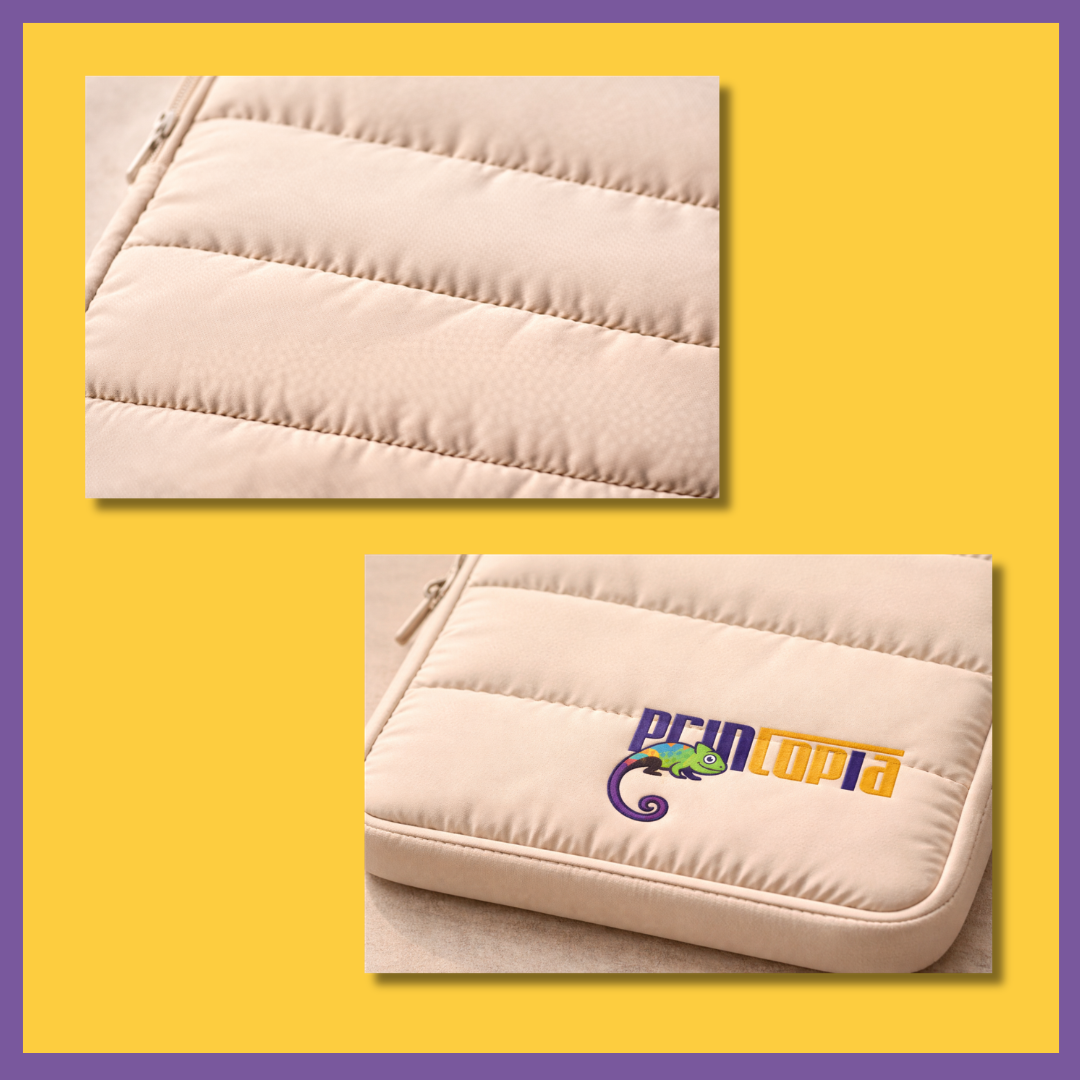 They protect the device, they slide inside a bag, and they go unnoticed. This one gets noticed. The puffy padded construction gives it a quilted, tactile quality that immediately feels different when picked up, different when seen on a desk, and different when photographed in an event gifting presentation. It is a laptop sleeve that looks like it was selected rather than sourced, which changes how the recipient perceives the gift before they have even seen the logo.