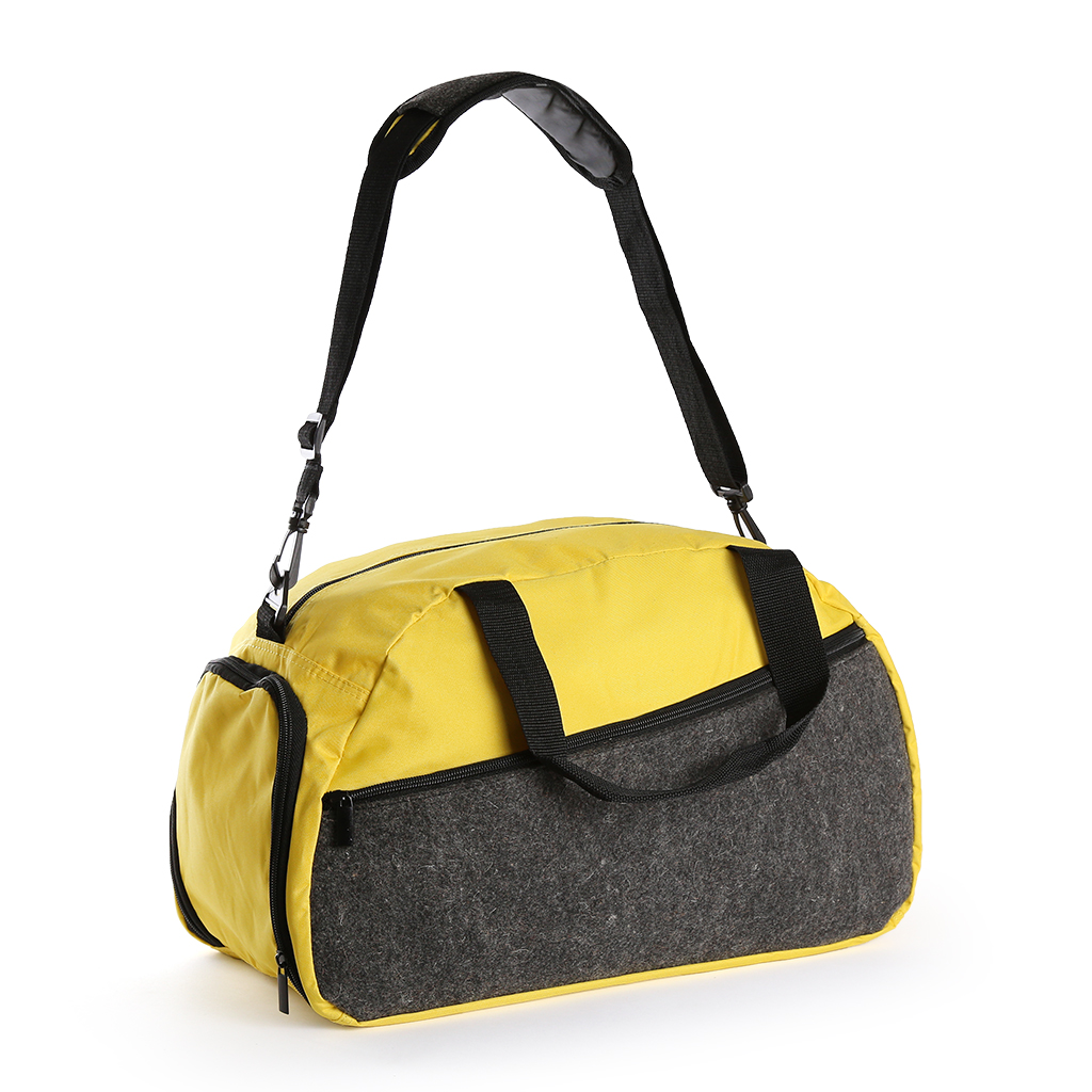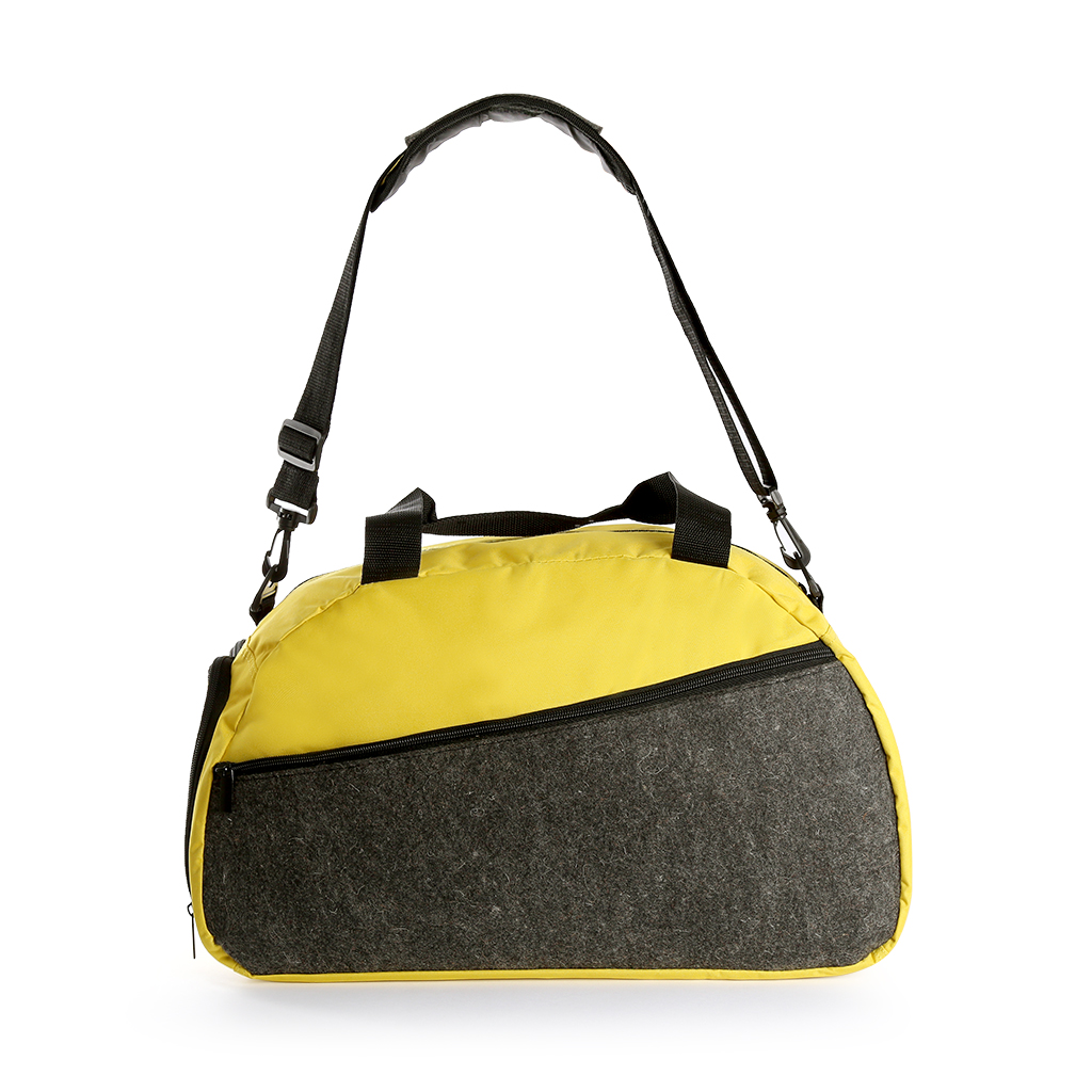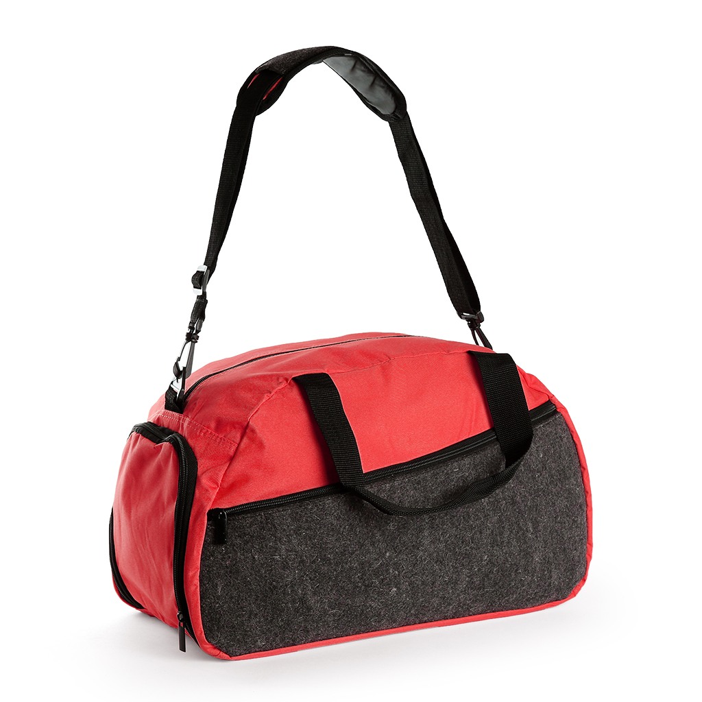 Nylon Felt travel bag with adjustable shoulder and shoe compartment. Front pocket with zipper closure.
