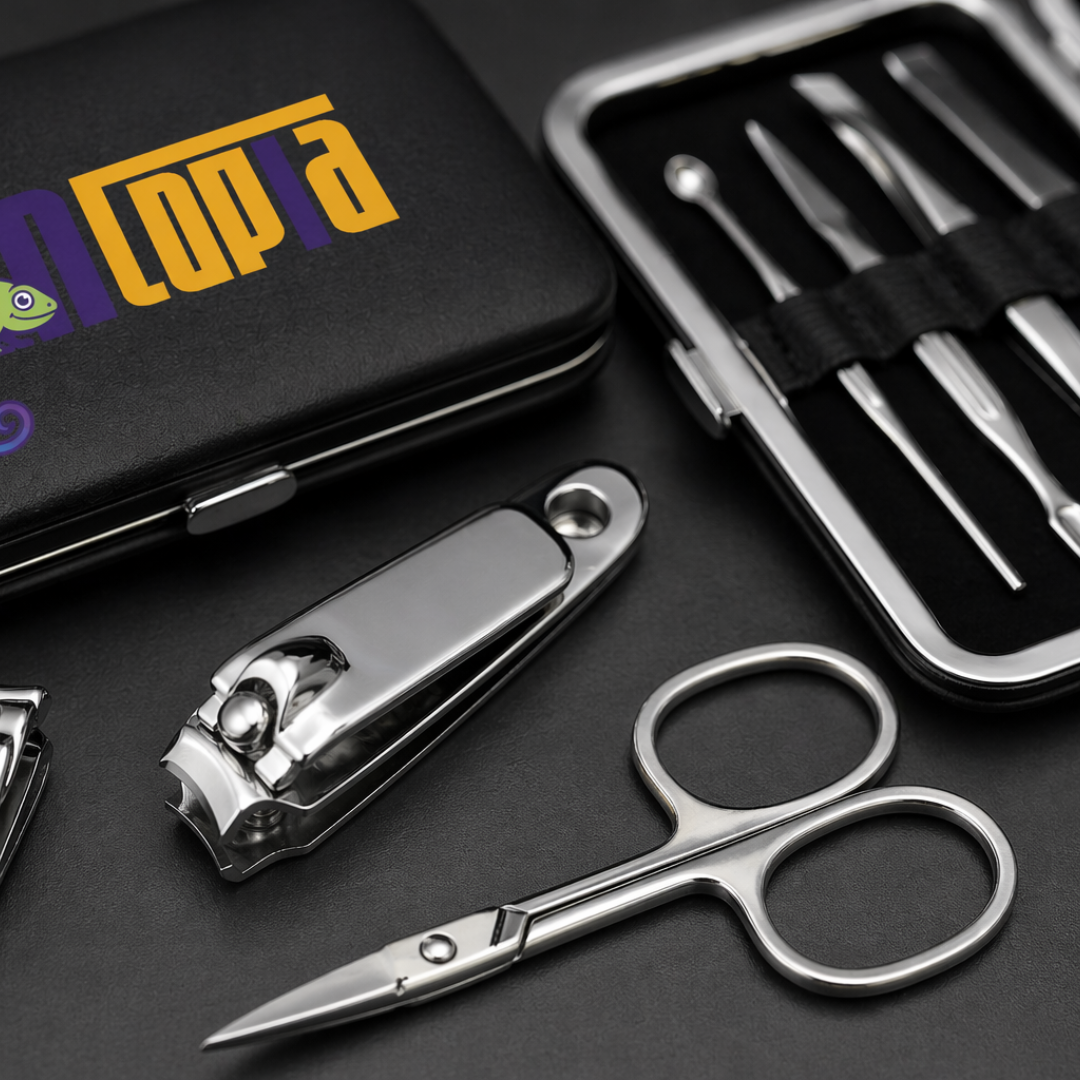 The 7-piece composition of the BP0004 covers both fingernail and toenail care in a single kit. While the exact tool list should be confirmed with the Printopia team, a standard 7-piece manicure and pedicure kit at this specification typically includes a large nail clipper for toenails, a small nail clipper for fingernails, cuticle scissors or cuticle nippers, a cuticle pusher, tweezers, a nail file or buffer, and an additional precision tool. This full suite addresses the complete grooming brief rather than selecting a subset of tools that covers only partial grooming needs.