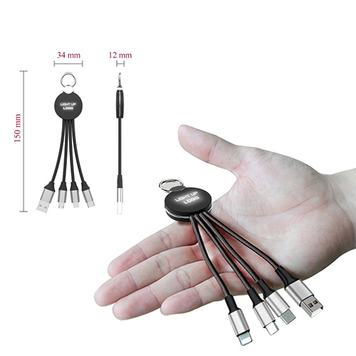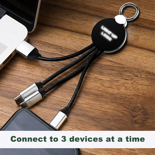 3 in 1, 2.1A fast charging cable with LED light up logo. Connect to 3 devices at the same time (Micro, Lightning and USB-C Output)