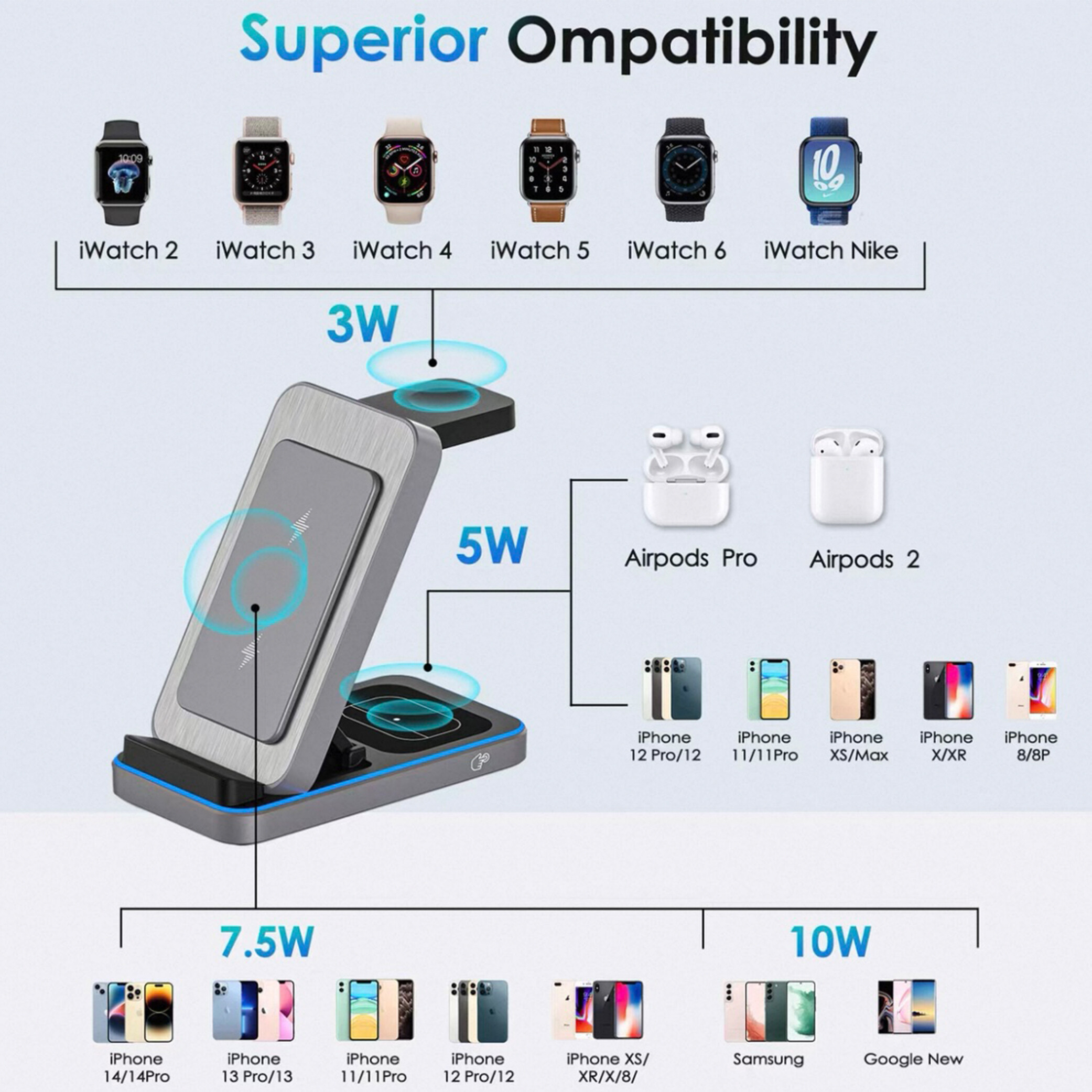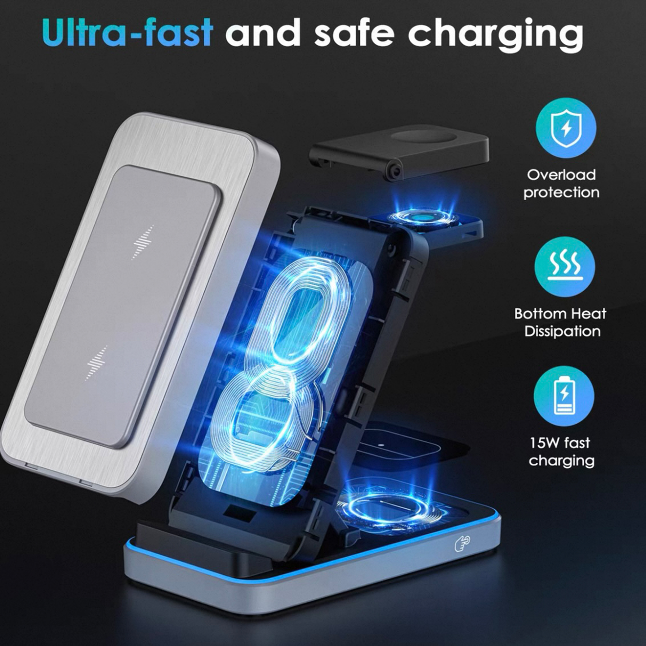 Charge smarter with the 3-in-1 Wireless Charger — a sleek, compact solution that powers your phone, smartwatch, and earbuds all at once. Featuring a foldable design and magnetic adjustable stand, it’s perfect for travel, work, or home. With 15W fast charging, built-in safety features like overcharge protection and temperature control, this charger keeps your devices powered and protected without the mess of cables.
