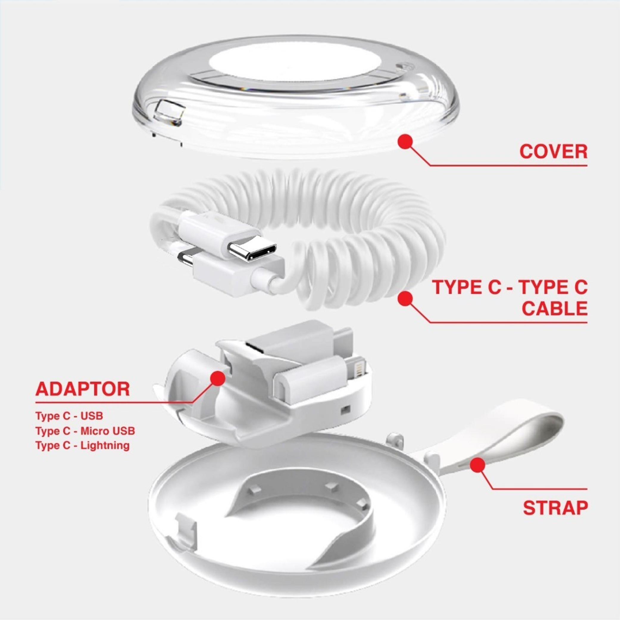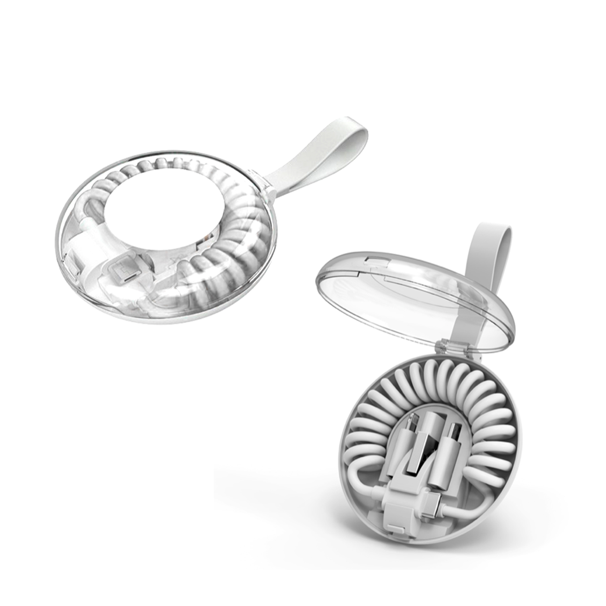 All-in-one quick charge & data cable with case – 85cm spring cable, USB-A to Type-C/Micro/Lightning (3.0A), PD Type-C to Type-C (60W), charges laptops, tangle-free, includes compact storage box.