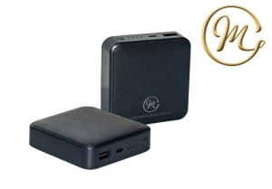 Palm size 10,000mAh portable charger with 4 LED light indicator indicating battery level. With USB and Micro port.