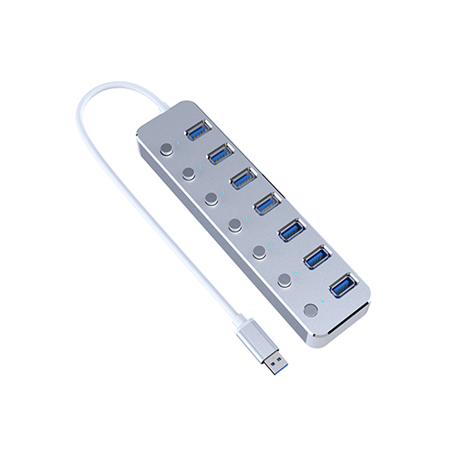 High speed 3.0 USB port with buttons, each switch controls a USB port, with blue light display. 7 plug and play ports. With built-in current protection device to effectively protect the connected equipment and the HUB itself.