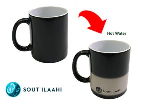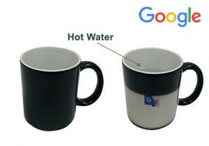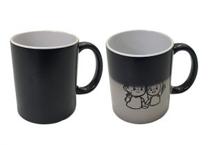 Colour changing mug that will turn from black to white when it touches hot water. Will slowly turn back white as the temperature cools down.
