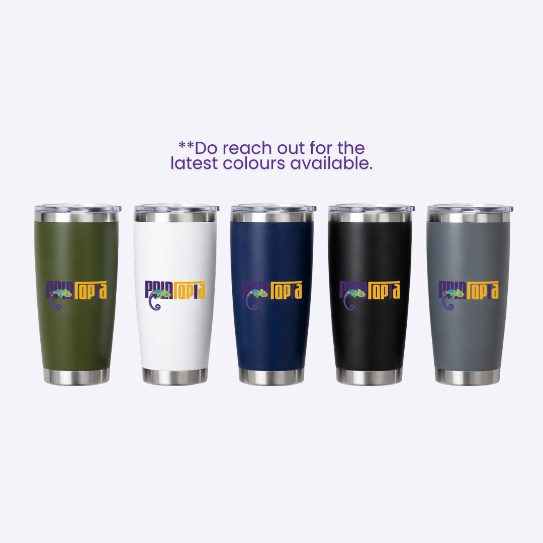 Three methods are available. Silkscreen printing is the most cost-effective option for bulk orders with one to three colour logos and is printed directly onto the tumbler body. Laser engraving removes the surface coating to create a permanent etched mark directly in the steel, producing a clean premium finish with no ink or colour. UV printing applies full-colour digital artwork directly to the surface, making it the best choice for complex logos, gradients or multi-colour designs. Contact Printopia to confirm which method best suits your artwork, order quantity and budget.