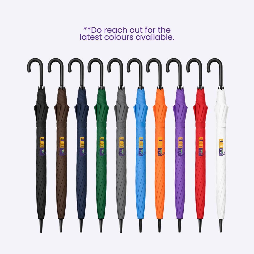 Brown is the warm professional neutral associated with premium leather goods, luxury accessories and traditional business culture. For law firms, financial advisory practices, premium hospitality organisations and brands whose identity includes warm earthy tones, a Brown straight umbrella is the only branded umbrella option in the Printopia catalogue.