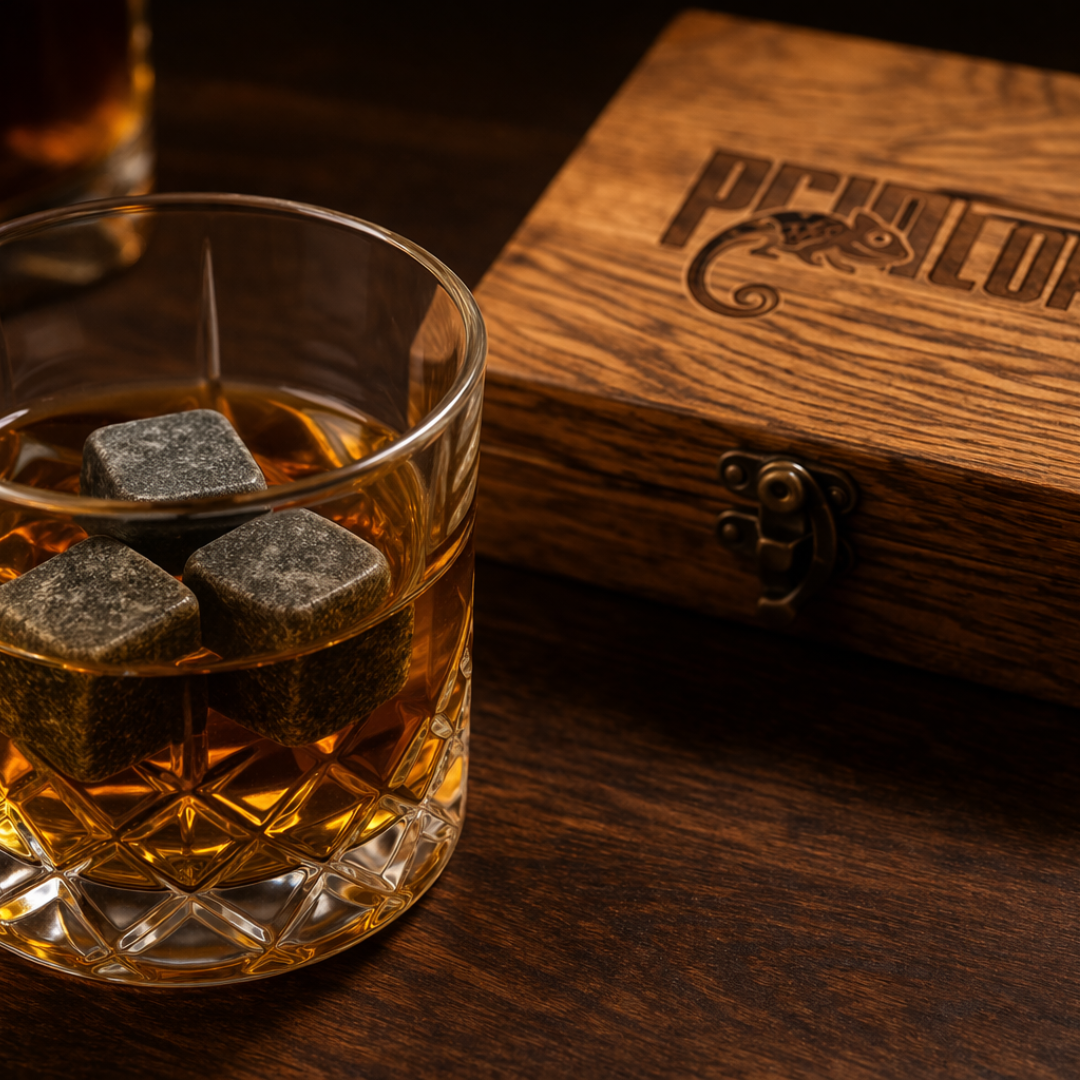 The set contains natural stone cubes designed for chilling spirits, housed in a wooden gift box. The stones are food-safe natural stone cut to a consistent cube shape for even chilling. The wooden box holds the stones securely for storage and display and provides the primary surface for laser-engraved branding. Please enquire for the exact stone count per set and any additional accessories such as tongs or a velvet storage pouch, and we will confirm the current set configuration.