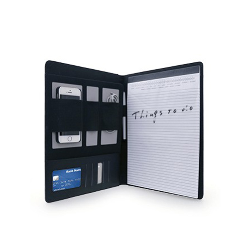 Lifestyle folder that holds A4 pad and has multiple compartments for cell phone and accessories, pen and cards. Suitable for travelling professional.