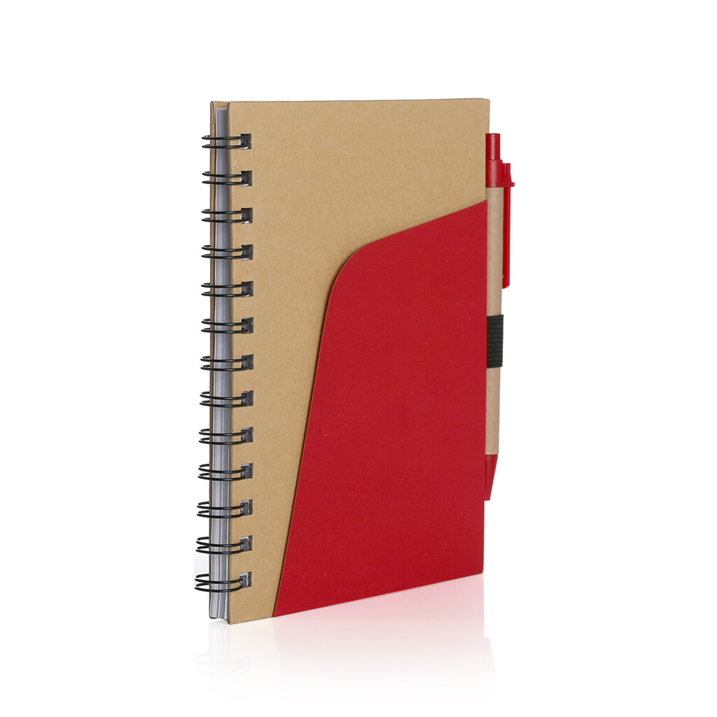 A5 size notebook with pen and front pocket on the cover. Pen with black colour ink.