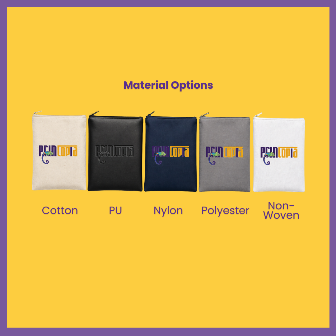 Five materials are available. Cotton suits lifestyle, eco-conscious and educational gifting contexts with a natural, warm feel and clean print surface. PU (polyurethane) provides a leather-like premium appearance for executive, institutional and high-end conference contexts. Nylon is the most durable and water-resistant option for tech accessories, travel and outdoor use contexts. Polyester is the most cost-effective option for high-volume conference and event kits. Non-woven is the lightest and most economical option for very high volume disposable-context distribution. Contact the Printopia team to discuss which material best suits your use case, recipient profile and budget.