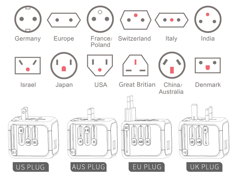4 USB universal travel adaptor made of full copper with nickle plating to protect plug