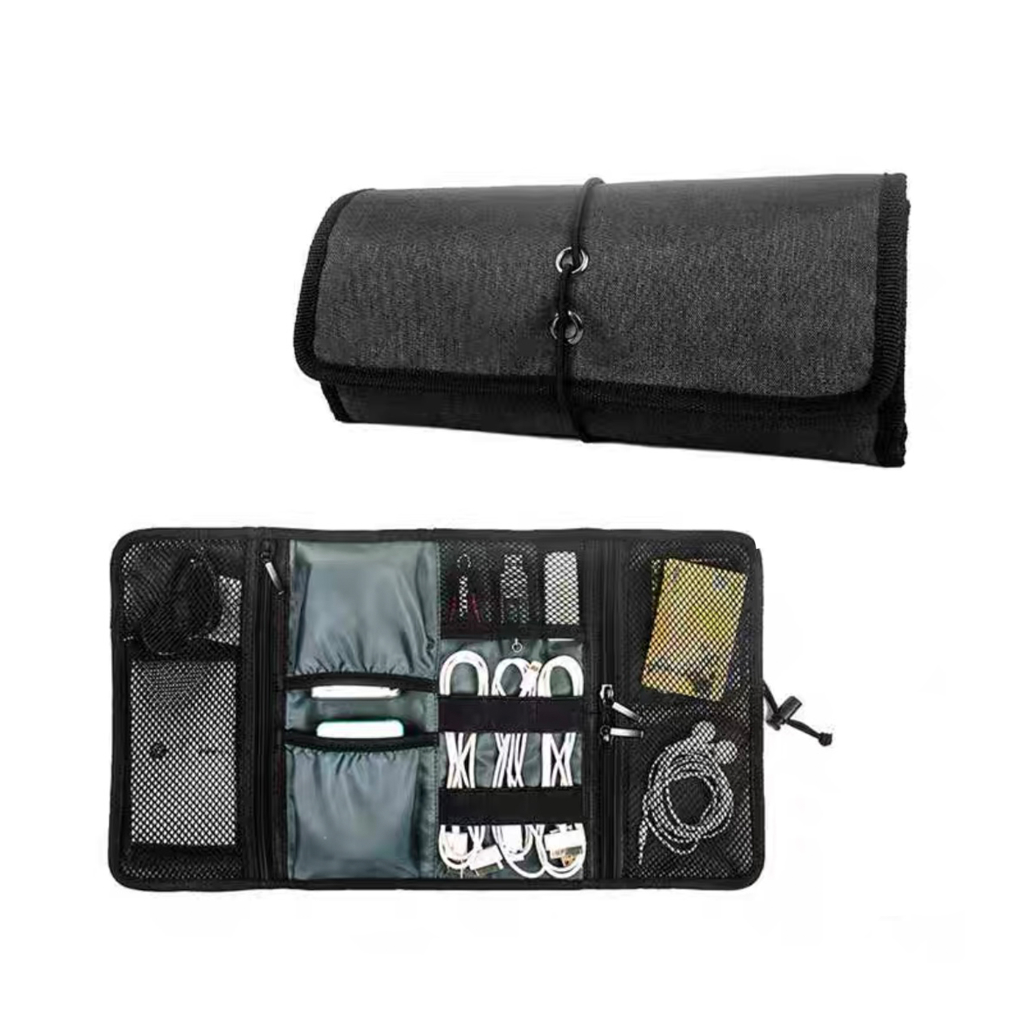 The Oxford Cloth Digital Pouch is designed for optimal organization and convenience. It features an inner compartment with 2 open pockets, 3 mesh pockets, 6 elastic bands, 1 large zipper pocket, and 2 small zipper pockets, providing ample space and secure storage for your digital accessories.